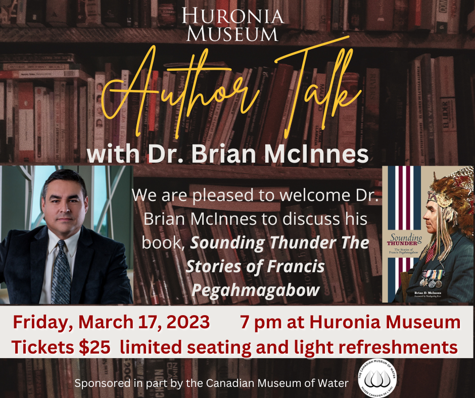 Huronia Museum is pleased to welcome Dr. Brian McInnes to discuss his book, Sounding Thunder, The Stories of Francis Pegahmagabow. Dr.McInnes, better known in the Anishinaabe community as Waabishki-makwa, proudly belongs to the Wasauksing First Nation. He is a great-grandson of Francis Pegahmagabow and an advocate for Indigenous land rights, language revitalization, and culture-based education. Brian presently serves as the Leola R Culver Professor of Philanthropy and Nonprofits at the...