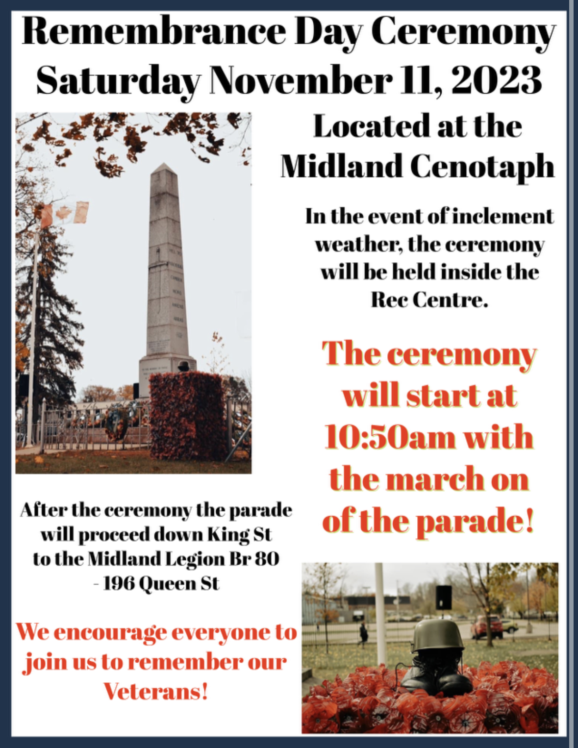There will be a Remembrance Day Ceremony on November 11th, 2023. There will be a service at the cenotaph starting at 10:50AM. After the service the parade will march down King Street to the Midland Legion.