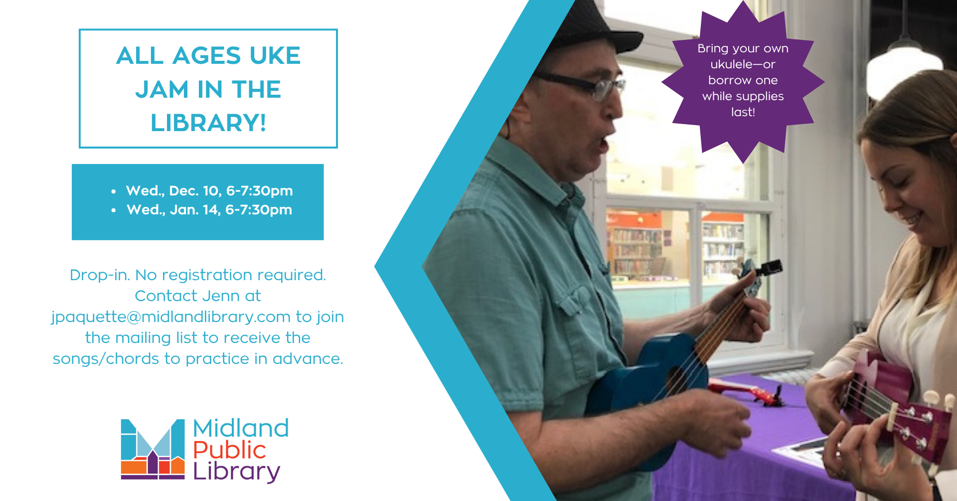 Drop-in. No registration required. Contact Jenn at jpaquette@midlandlibrary.com to join the mailing list to receive the songs/chords to practice in advance.